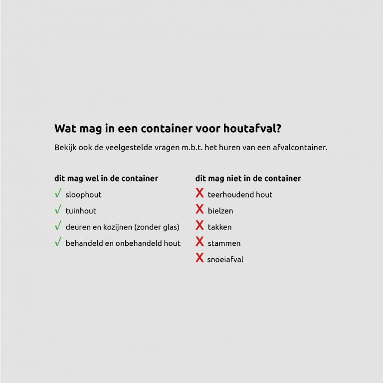 Een container huren is de oplossing om snel verschillende soorten afval, dat is ontstaan tijdens het verbouwen of renoveren, af te voeren. De container voor houtafval kunt u gebruiken om onder andere sloophout af te voeren. Zie in het schema hieronder precies wat er wel of niet in mag.