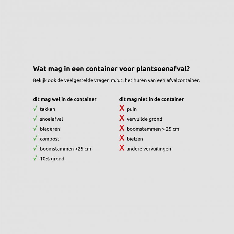 Een container huren is de oplossing om snel verschillende soorten afval, dat is ontstaan tijdens het verbouwen of renoveren, af te voeren. De container voor groenafval kunt u gebruiken om bijvoorbeeld snoeiafval, bladeren of boomstammen af te voeren. Zie in het schema hieronder precies wat er wel of niet in mag.