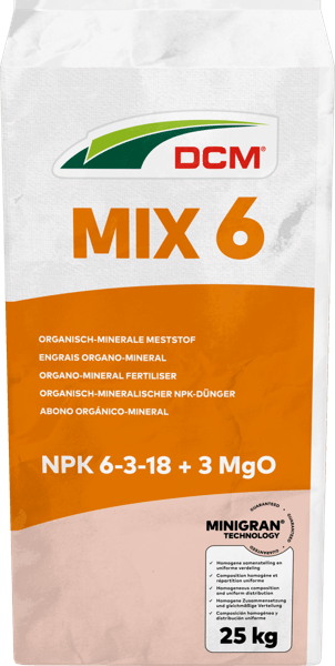 DCM MIX 6 is een voornamelijk organische meststof welke gewassen afhard. Het maakt bomen, struiken, vaste planten & gazons klaar voor de winter. Doordat in deze meststof de nadruk ligt op extra kalium zullen de plantencellen zich niet strekken maar kort op elkaar gaan zitten. Het gewas wordt hierdoor extra stevig.